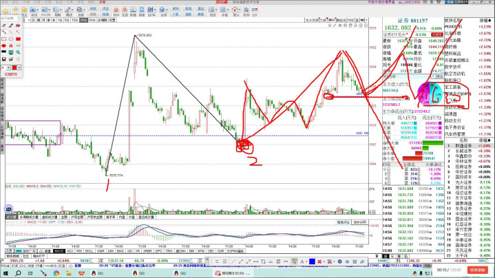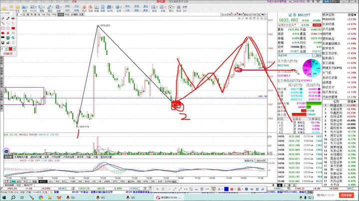 说下证券,证券日线没什么好说的,中枢正道没有选择方向,在三十分钟结构上面。从目前的走势上来看,如果把这个位置当一买是二买,二买产生之后内部有一个小结构中枢,现在是在中枢离开段,产生之后回落,回落一六二九是非常重要的支撑位,这个点位最好不要破,破了之后需要快速拉回,不然这个位置这一笔向上就结束了,后面一笔向下看跌破前,跌破这个位置。